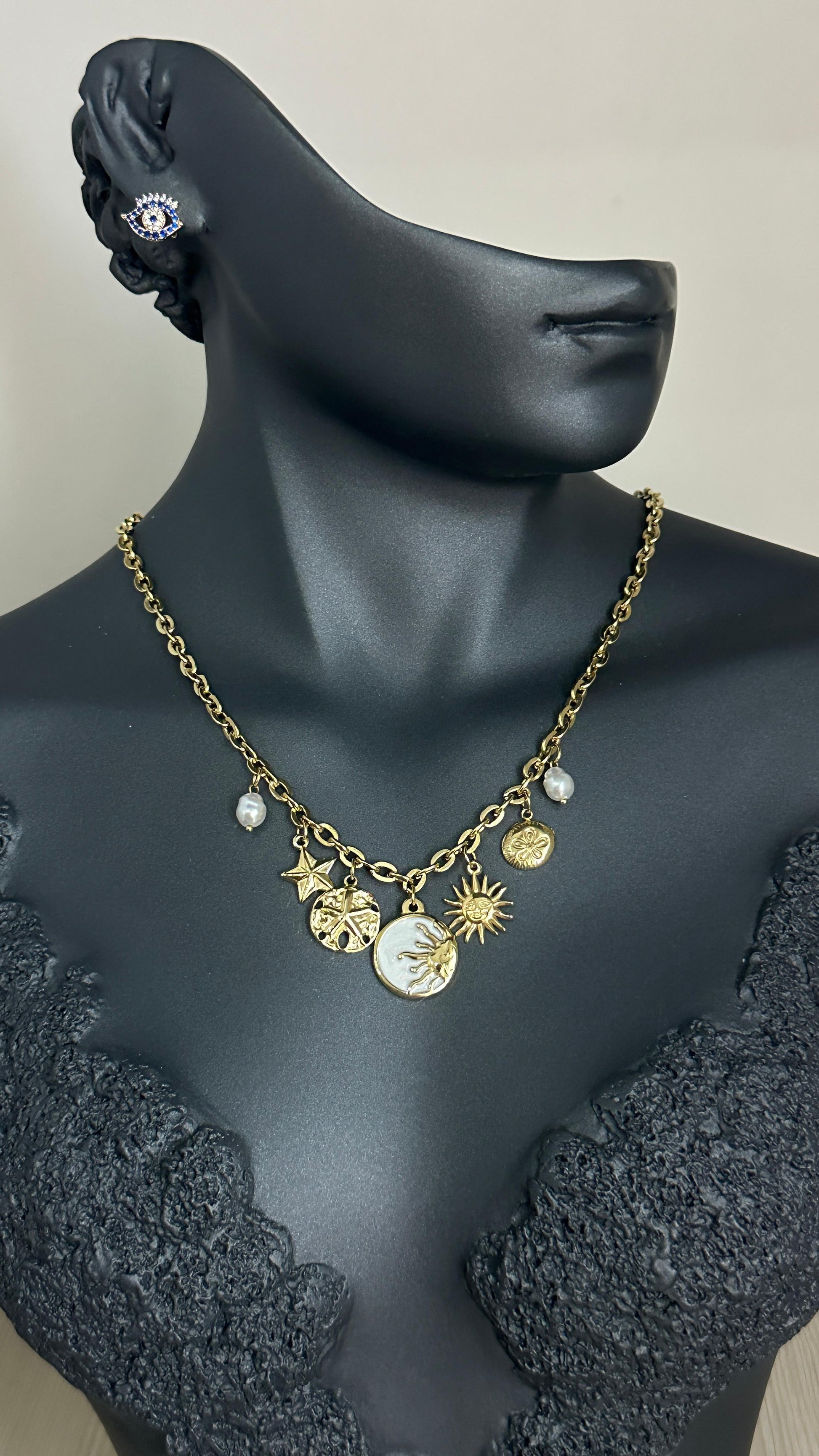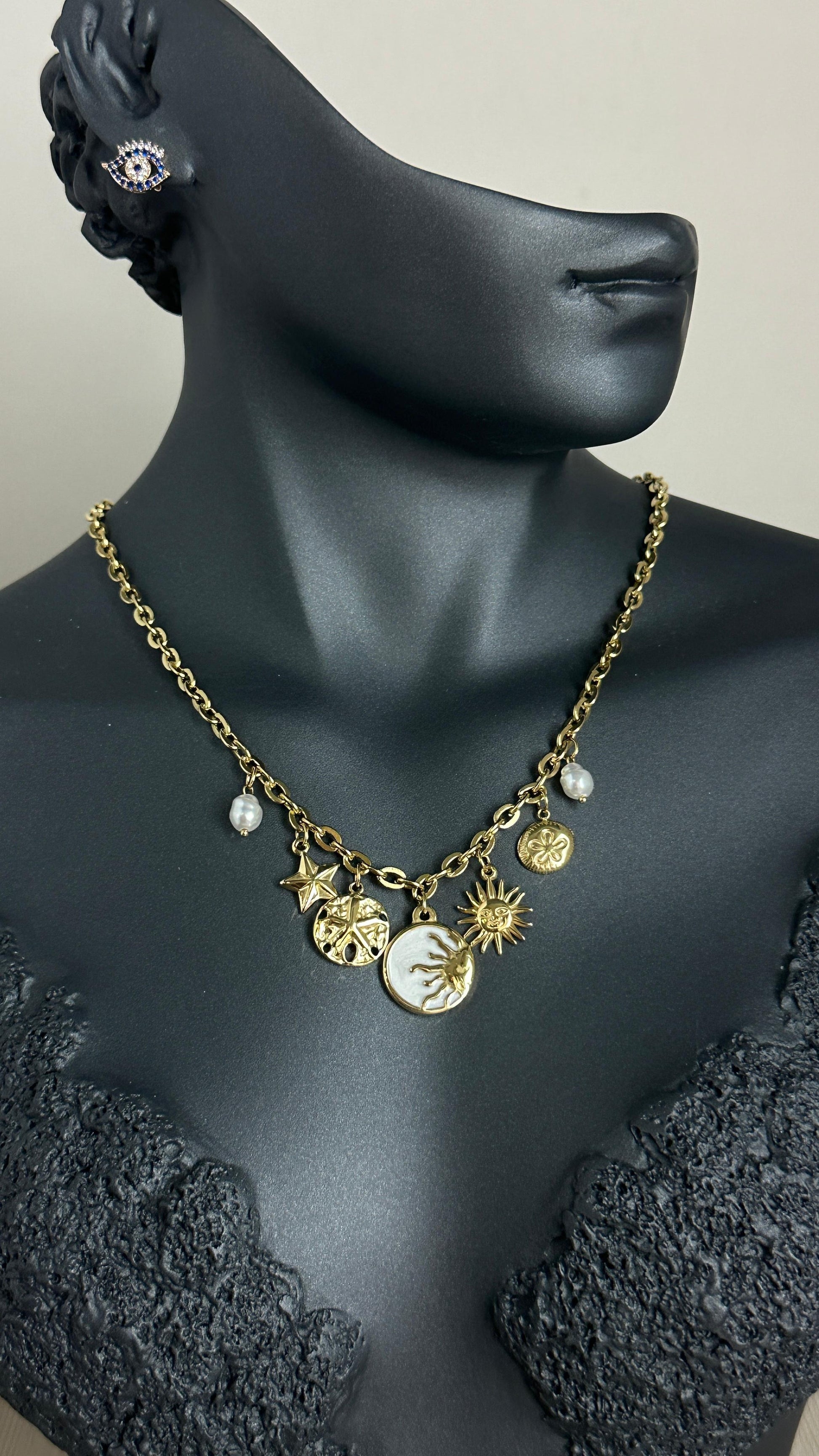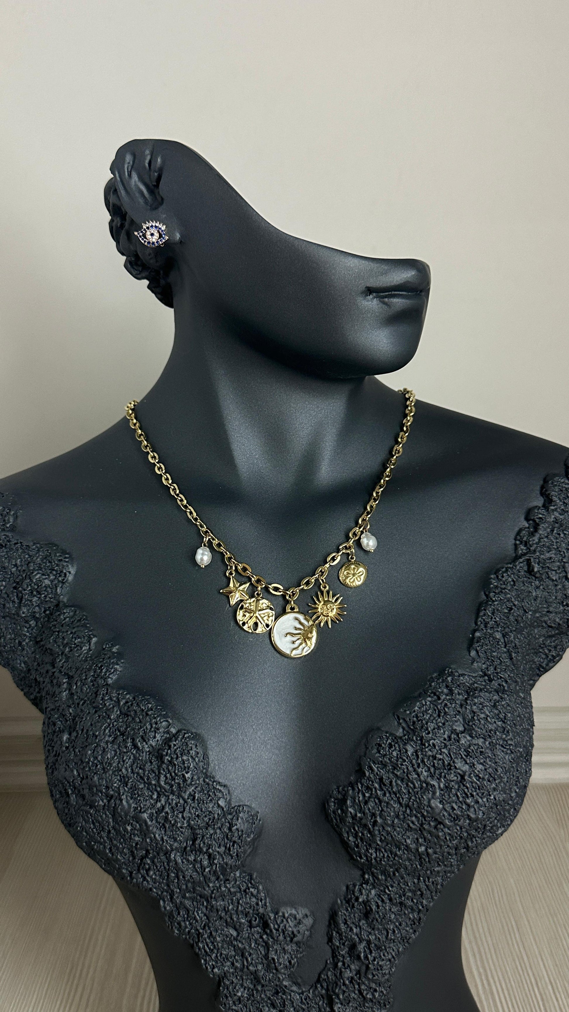 316L Çelik Gold Bohem Beyaz Mineli Gün Batımı Charm Figür Detay Kadın Kolye