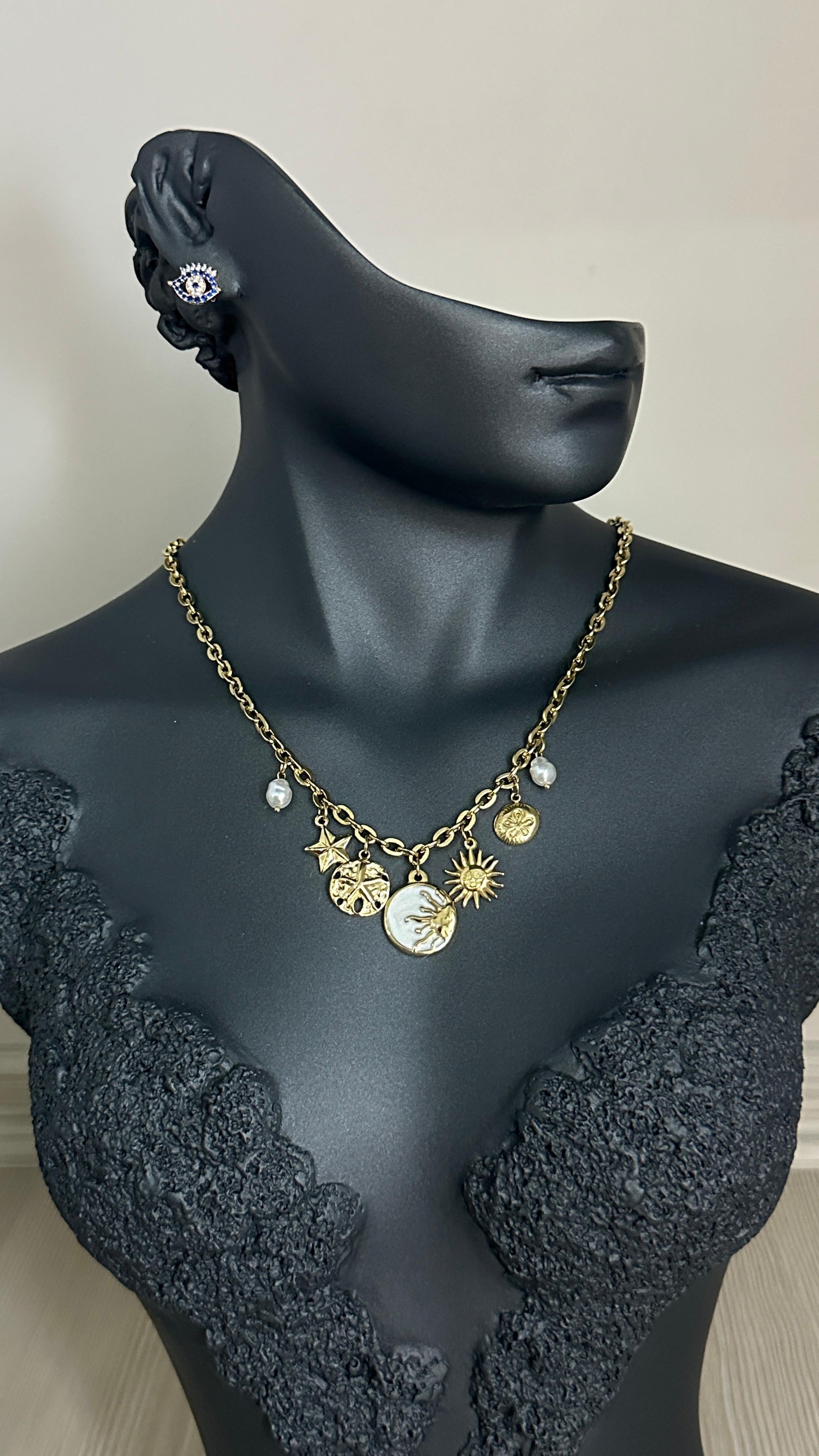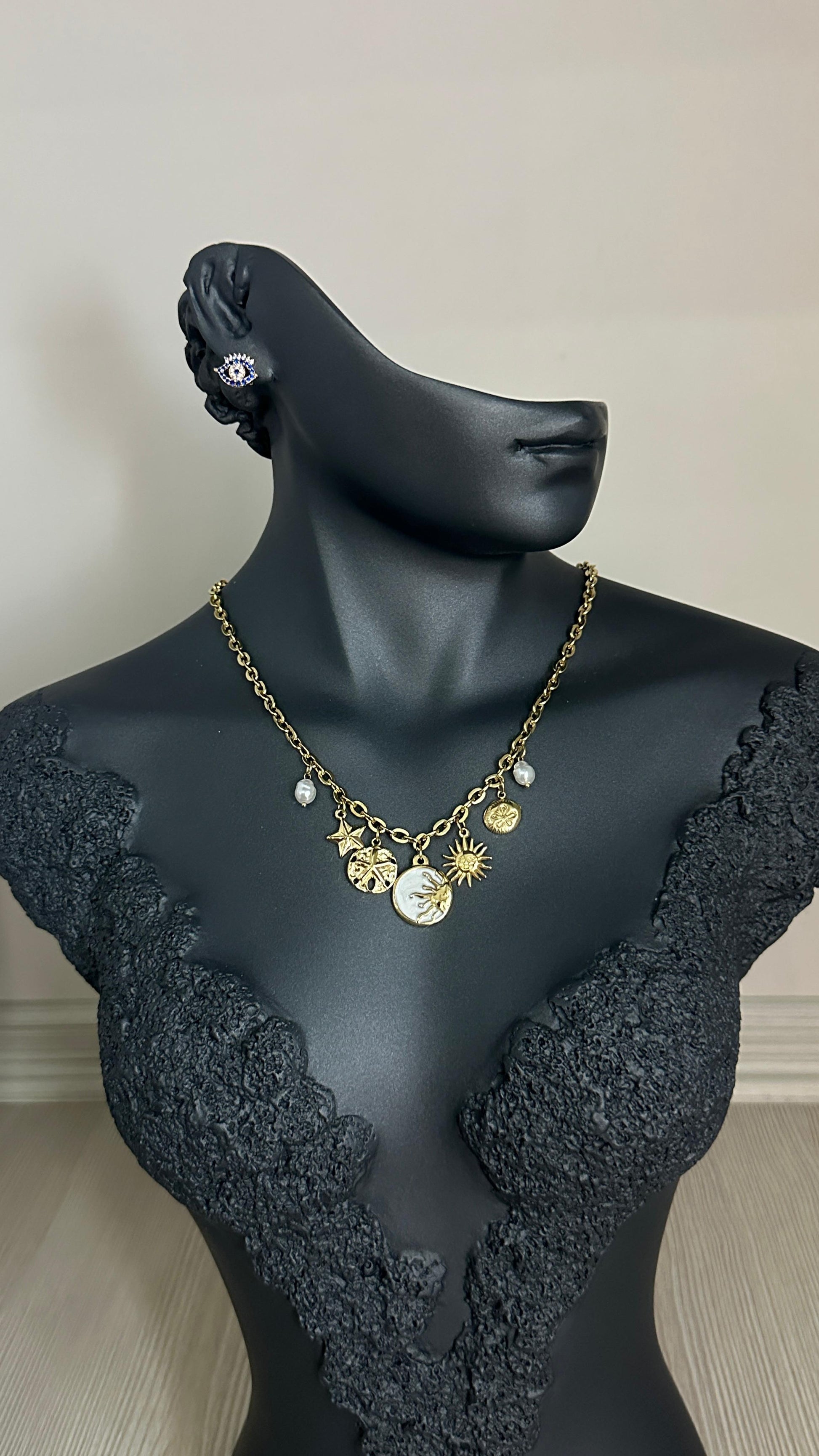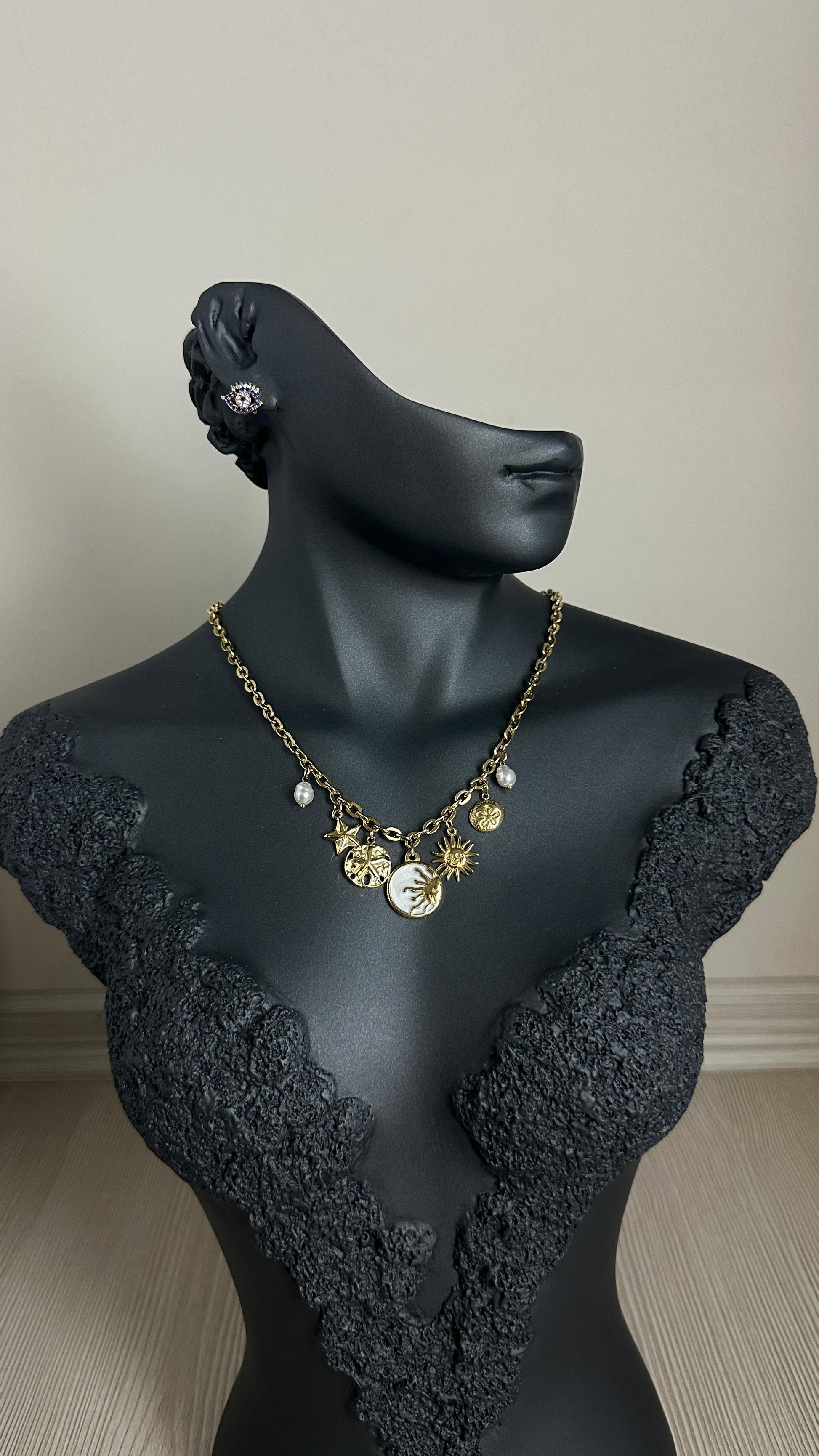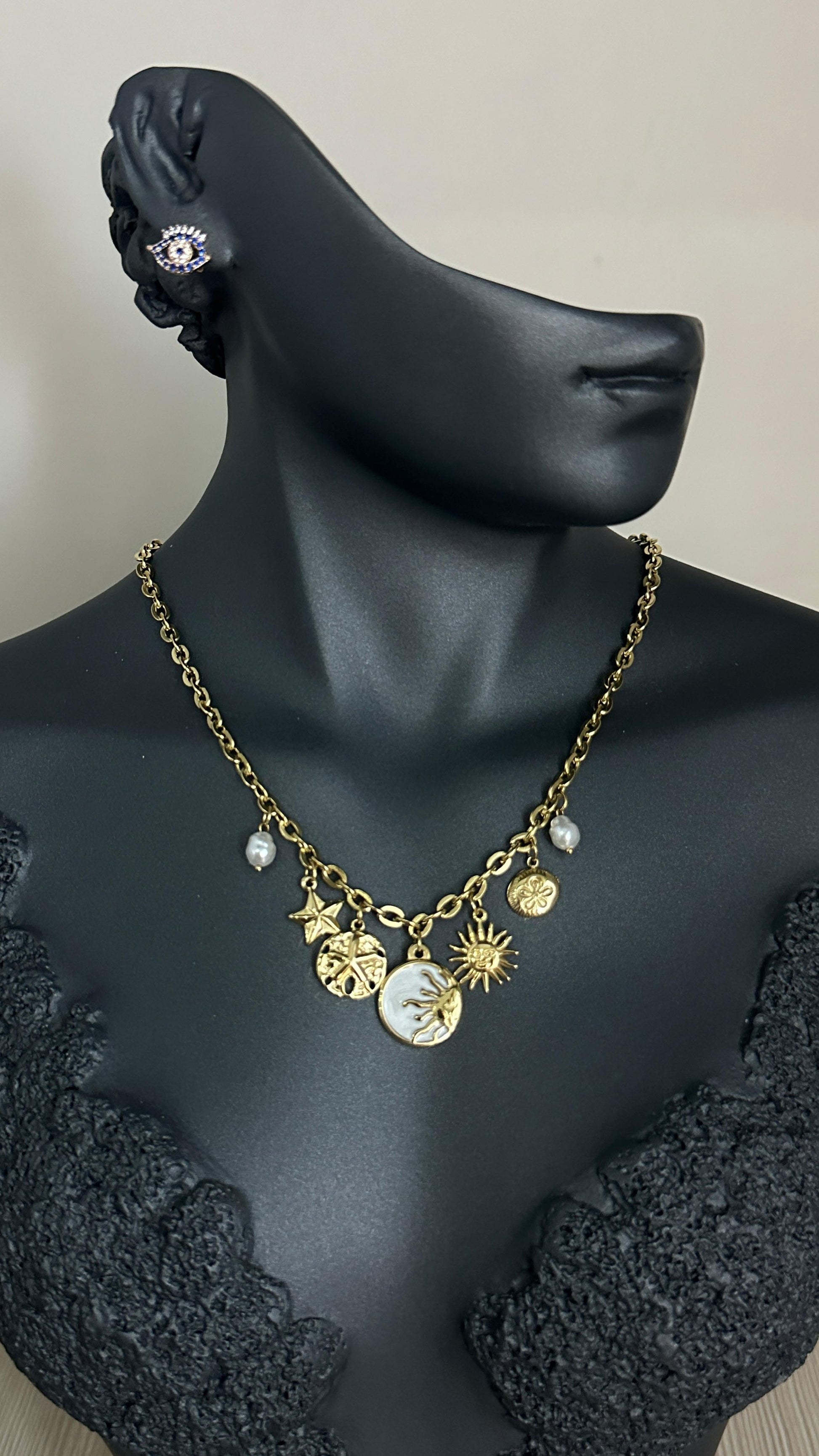 316L Çelik Gold Bohem Beyaz Mineli Gün Batımı Charm Figür Detay Kadın Kolye