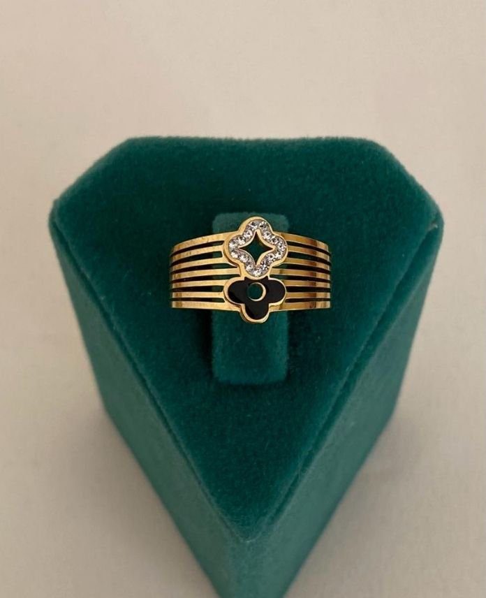 Şıklığın ve anlamın birleştiği bu özel tasarım yüzük, çift yonca motifiyle şansı ve zarafeti aynı anda taşıyor. Siyah taş zemin üzerine yerleştirilmiş çift yonca detayı, gold kaplama ile bütünleşerek etkileyici bir görünüm sunar. Ayarlanabilir yapısıyla her parmağa kolayca uyum sağlar.