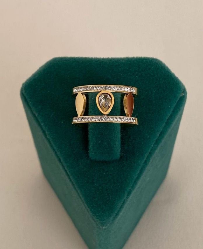 Çelik Gold Ayarlamalı Damla Taşlı Kenarlı Yüzük, minimalist tasarımı ve zarif taş detaylarıyla her kombine uyum sağlar. Güçlü ve dayanıklı malzeme yapısı sayesinde uzun süreli kullanım için idealdir.