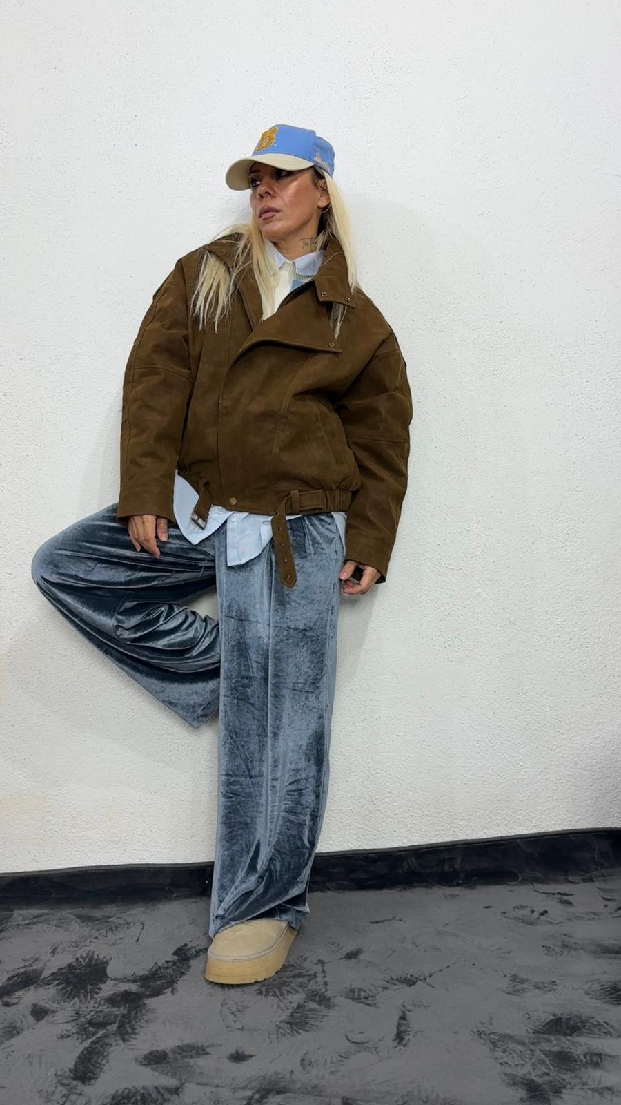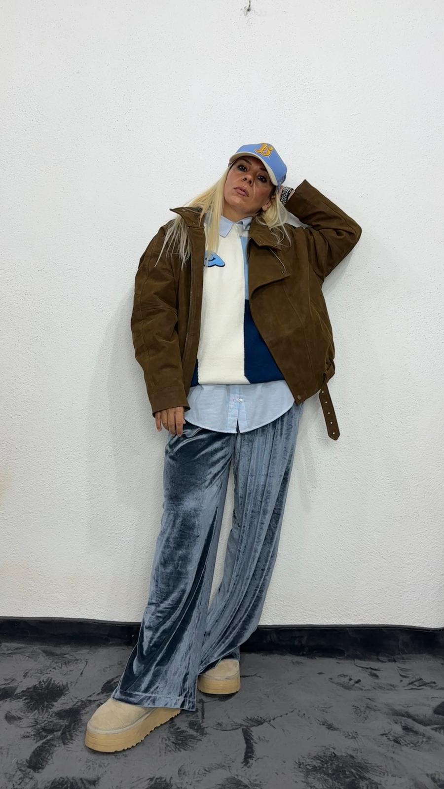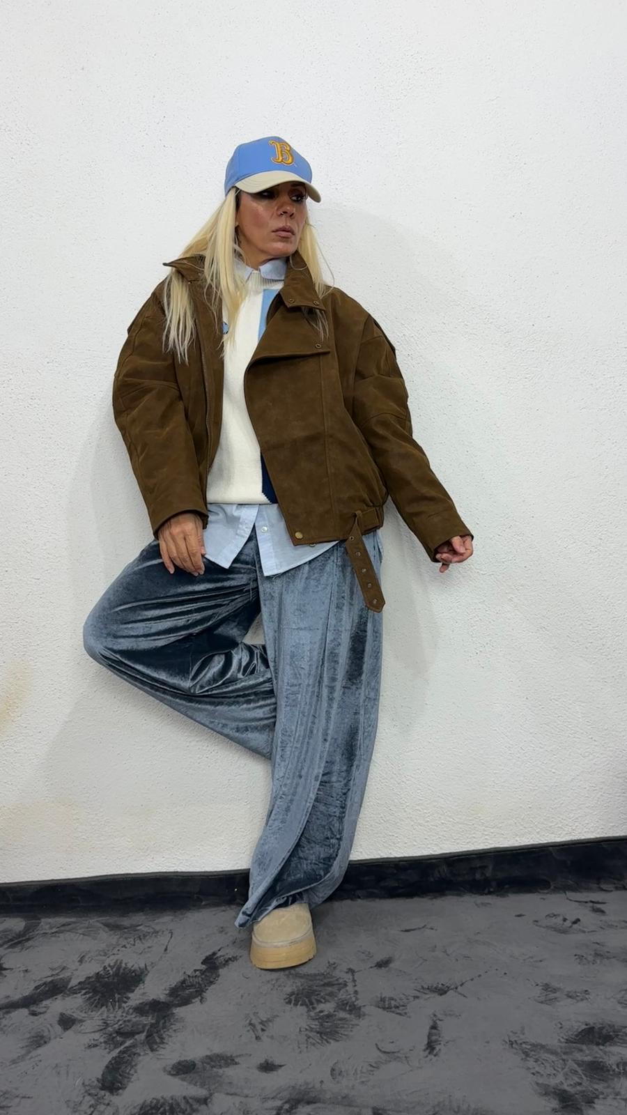 Soğuk havalarda konforu ve trend görünümü bir araya getiren NuNu By Haftanın Kombini, şehir stilini güçlü dokularla tamamlıyor. Taba süet bomber ceket, yumuşak dokulu kalın triko kazak ve kadife pantolonun uyumu; hem modern hem de zahmetsiz bir şıklık sunar.
