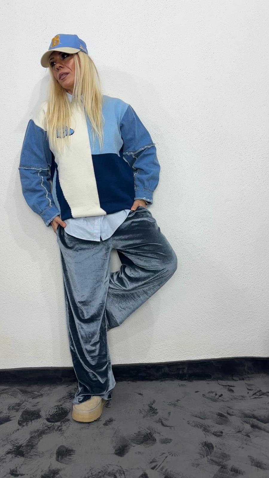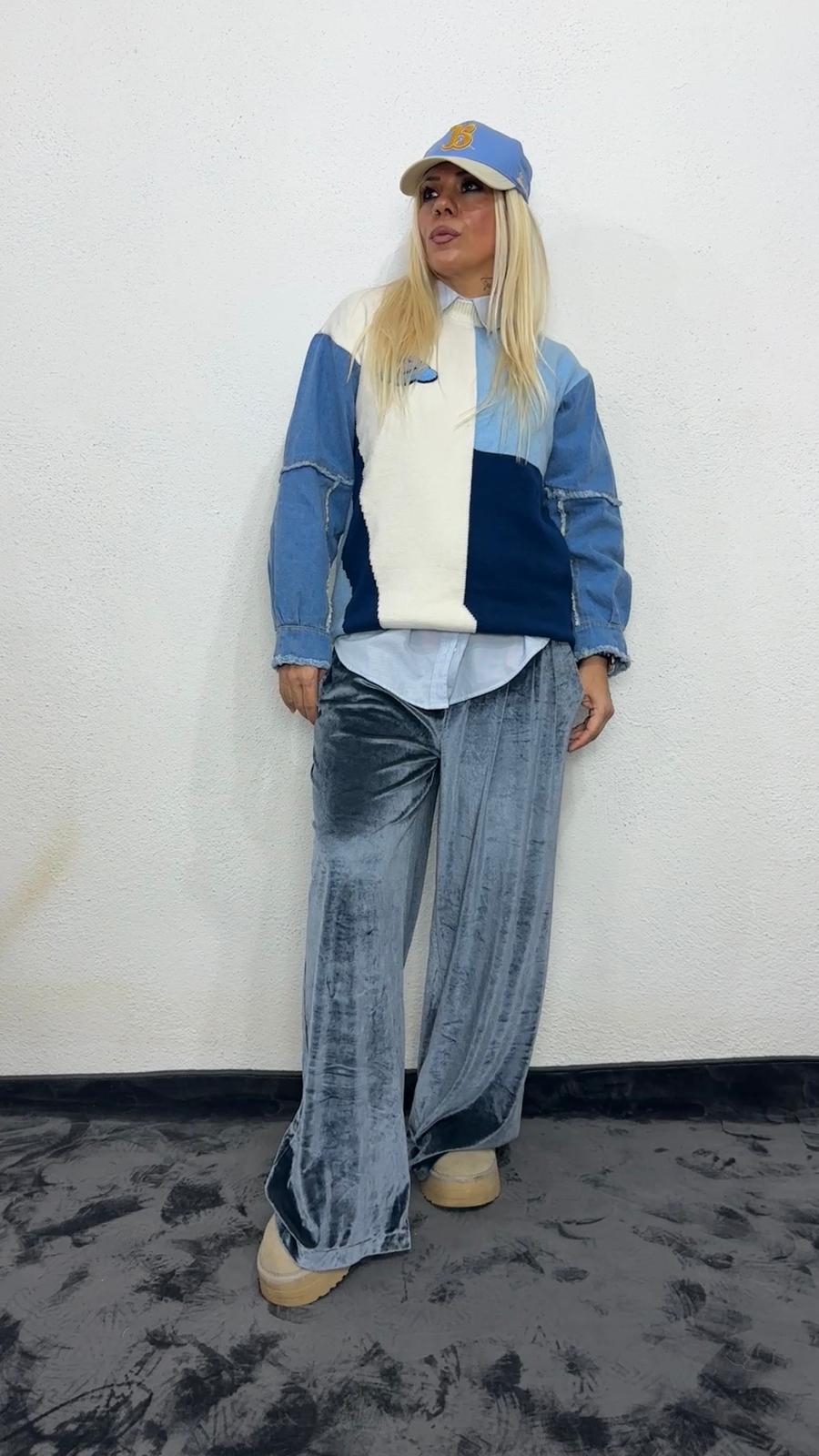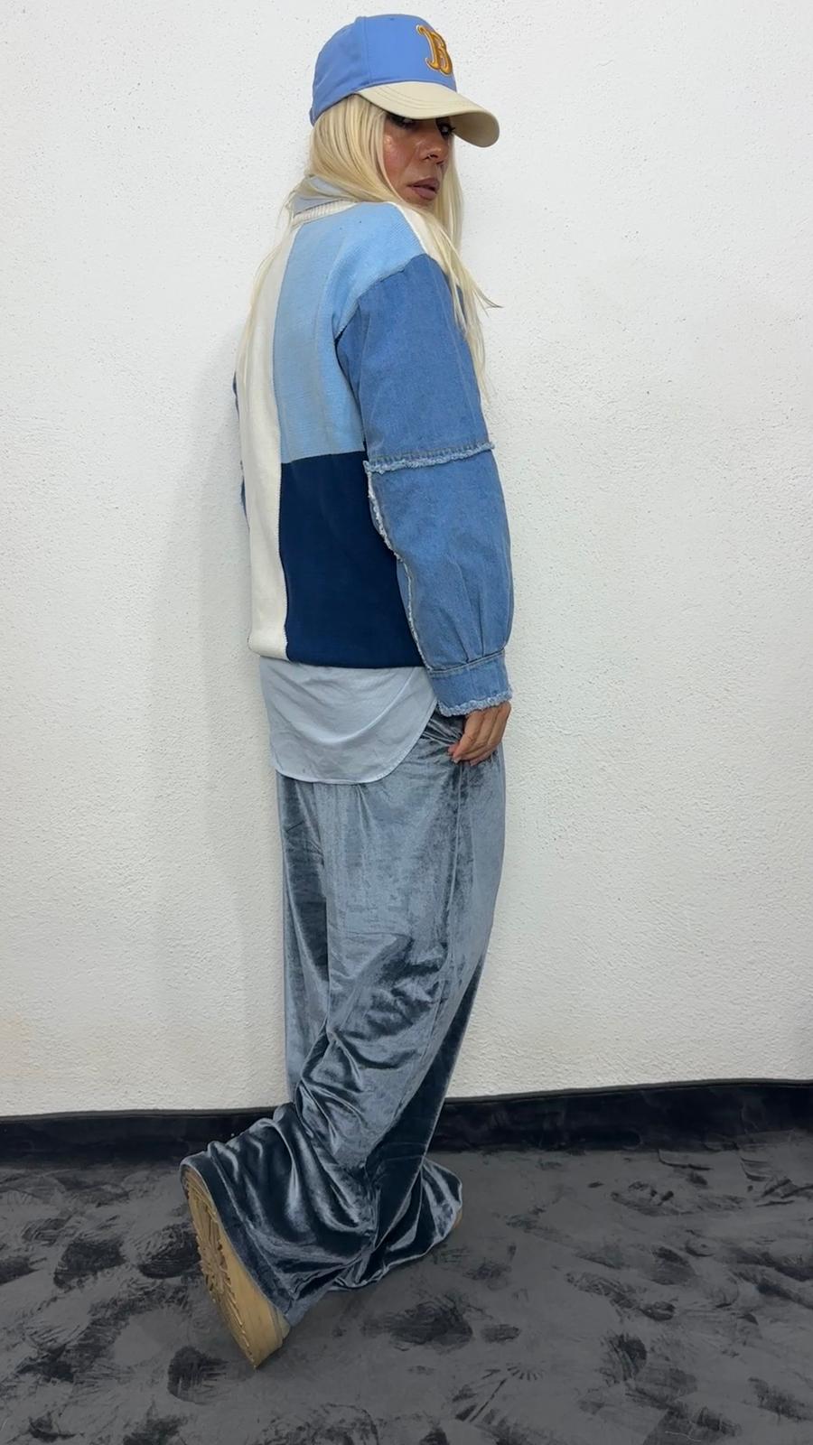 Oversize kalıplar sayesinde rahat bir kullanım sağlayan bu kombin, günlük şehir hayatından hafta sonu stiline kadar geniş bir kullanım alanına sahiptir. Dokuların kontrastı ve renk geçişleriyle dikkat çeken kombin, tek parça satın alma kolaylığıyla stilinizi tamamlar.