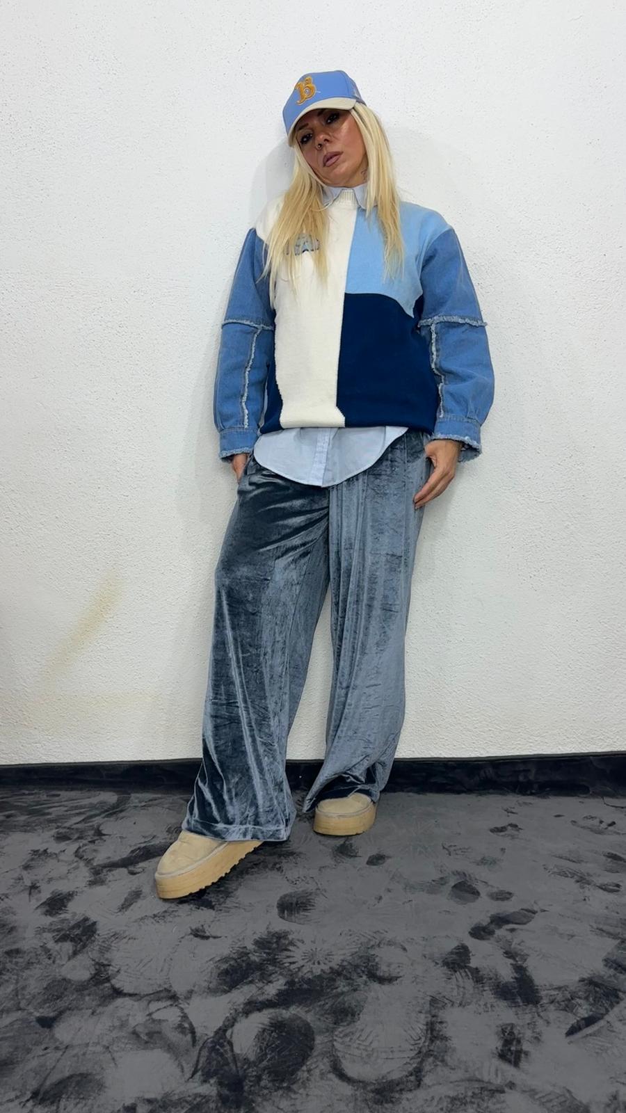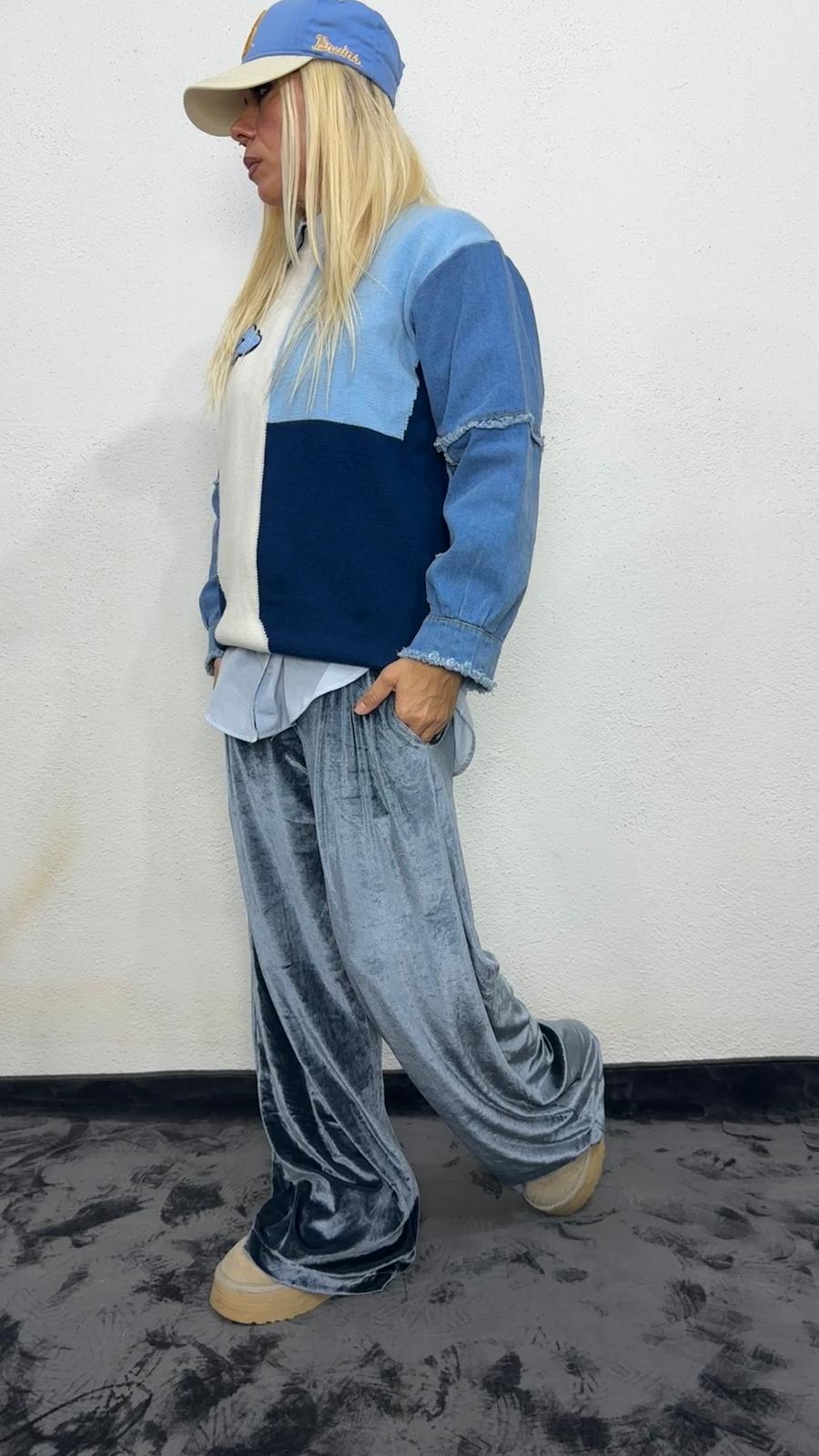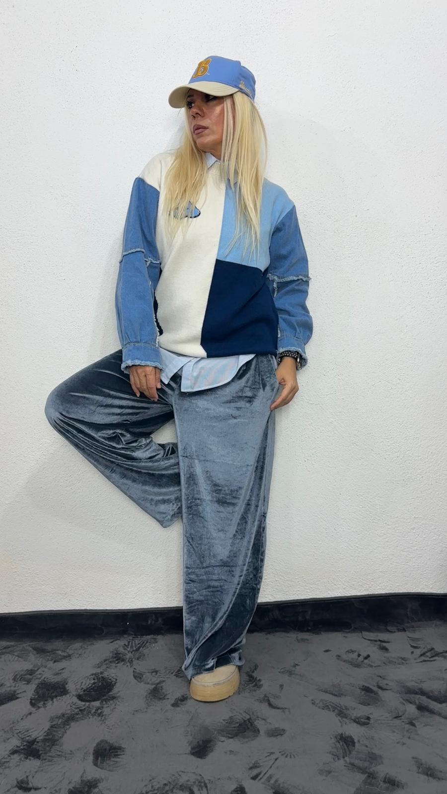 Oversize kalıplar sayesinde rahat bir kullanım sağlayan bu kombin, günlük şehir hayatından hafta sonu stiline kadar geniş bir kullanım alanına sahiptir. Dokuların kontrastı ve renk geçişleriyle dikkat çeken kombin, tek parça satın alma kolaylığıyla stilinizi tamamlar.
