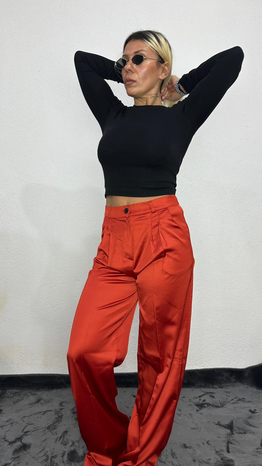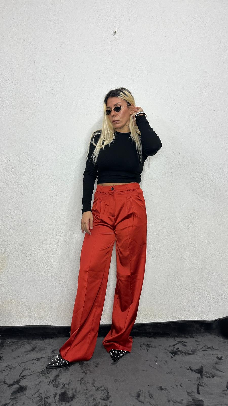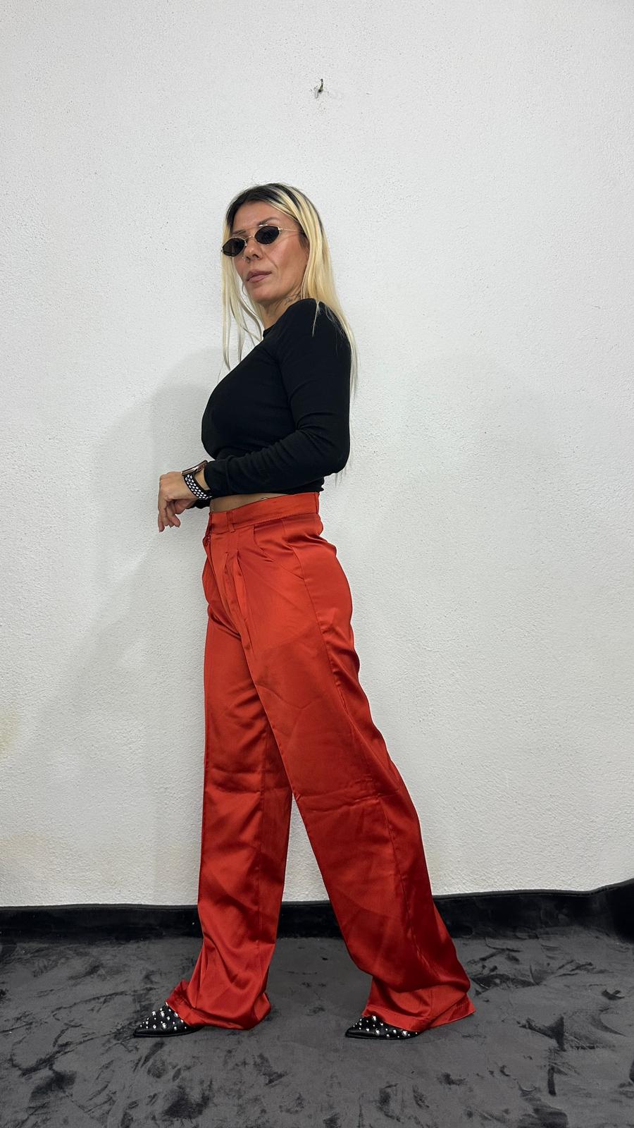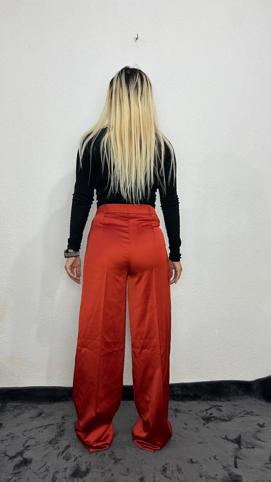 Zamansız ve güçlü bir renk seçimi sunan NuNu By Aura Kiremit Saten Pileli Pantolon, kiremit tonunun sıcaklığıyla stilinize karakter katar. Akıcı saten kumaşı ve pileli yapısı sayesinde her adımda zarif bir hareket sağlar.