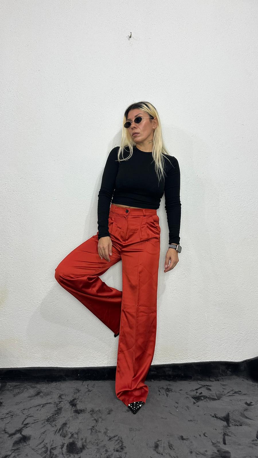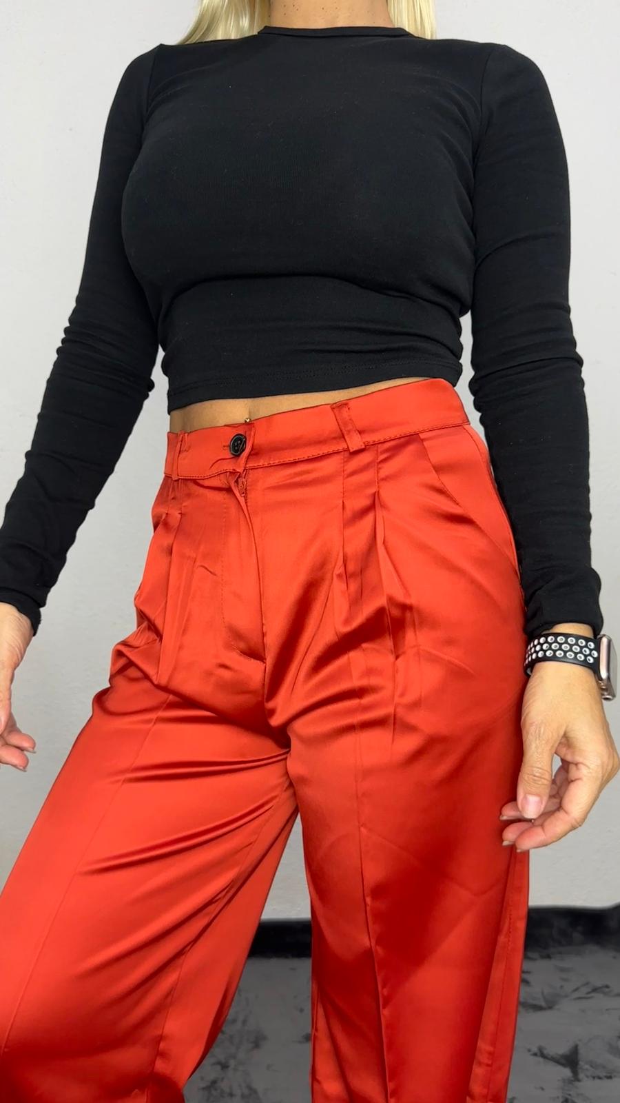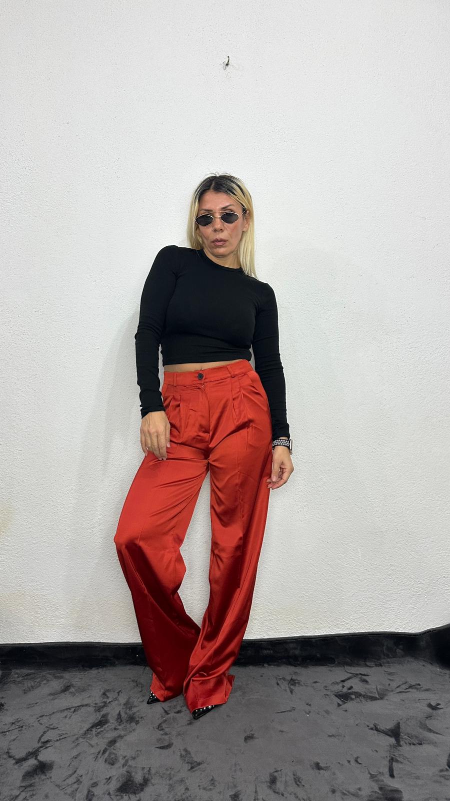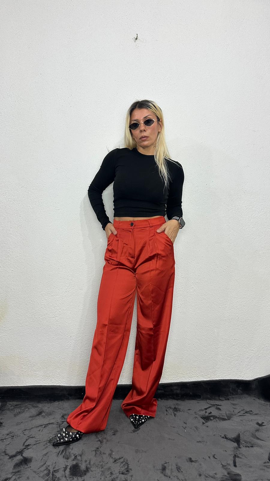 Zamansız ve güçlü bir renk seçimi sunan NuNu By Aura Kiremit Saten Pileli Pantolon, kiremit tonunun sıcaklığıyla stilinize karakter katar. Akıcı saten kumaşı ve pileli yapısı sayesinde her adımda zarif bir hareket sağlar.