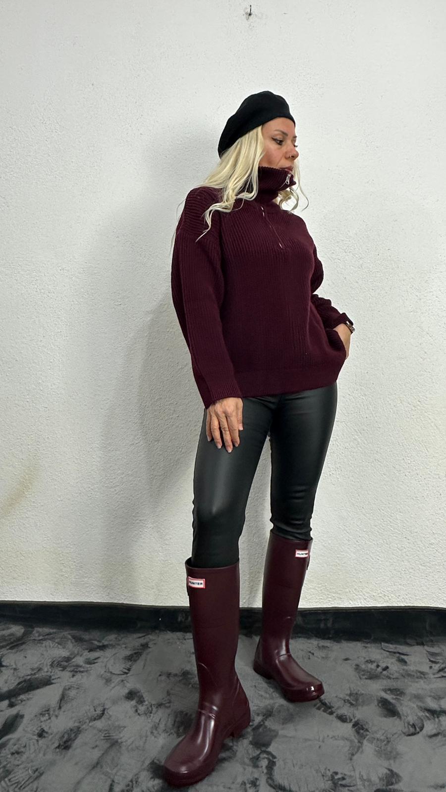 Nunu By Cosy Comfort Bordo Polo Yaka Fermuarlı Kazak