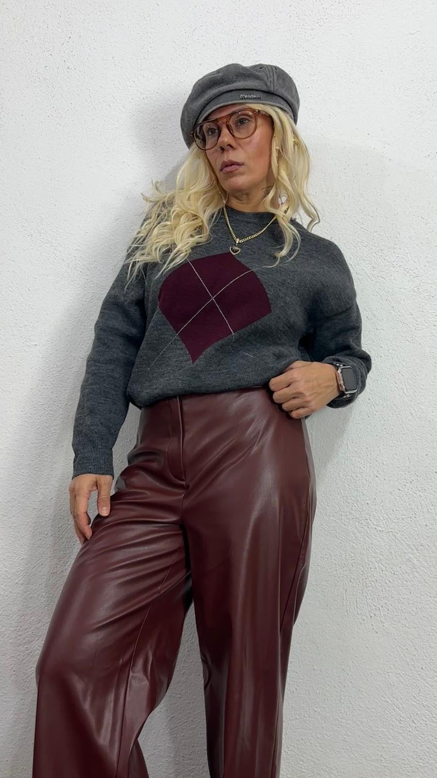 Nunu By Misty Grey Gri Bordo Baklava Desen Kazak, şıklığınızı tamamlayan rahat ve modern bir parça!