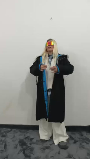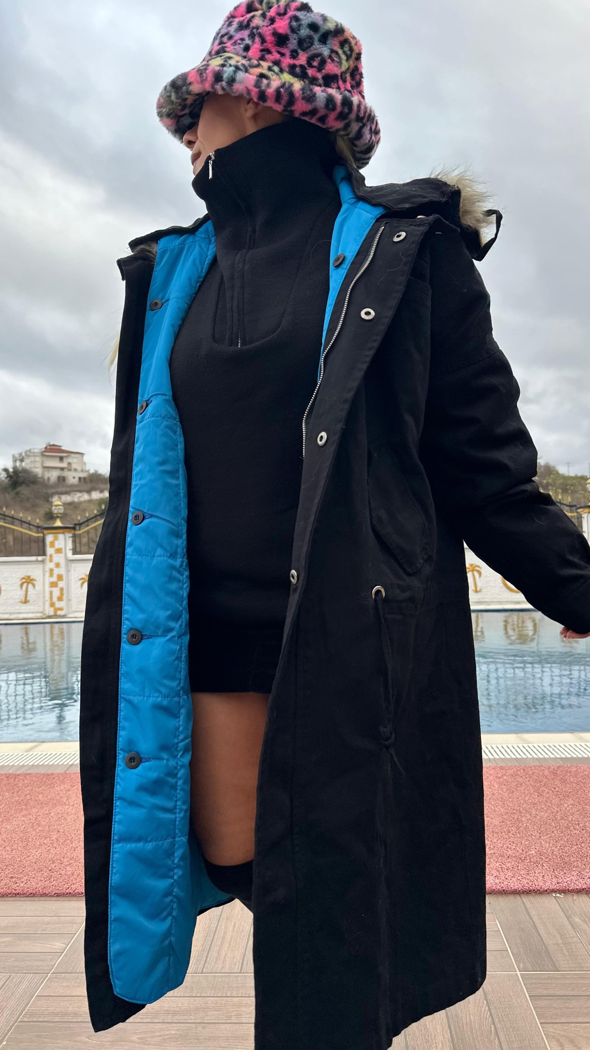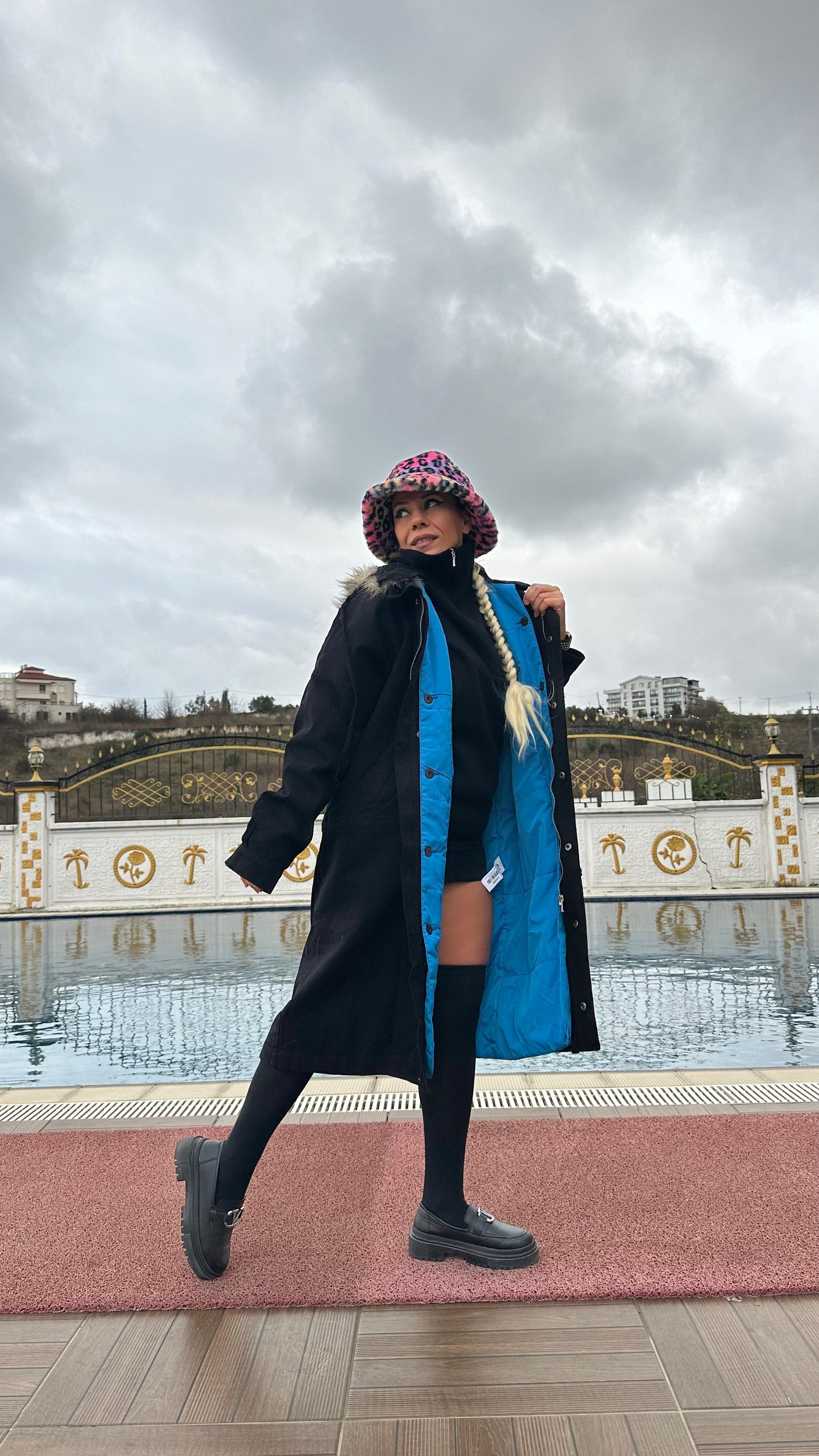 NuNu By Noir Siyah Tüylü Kapüşonlu Oversize Gabardin Mont