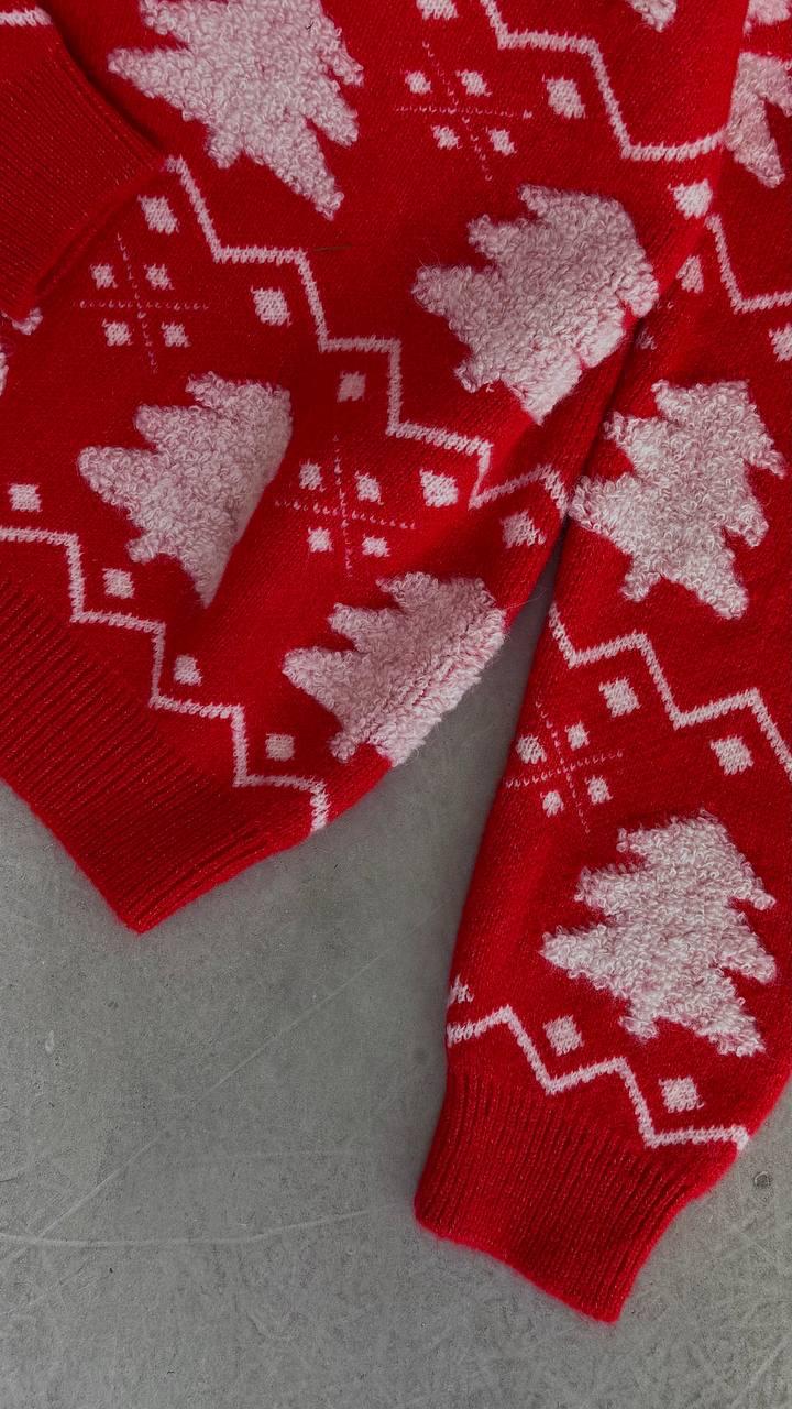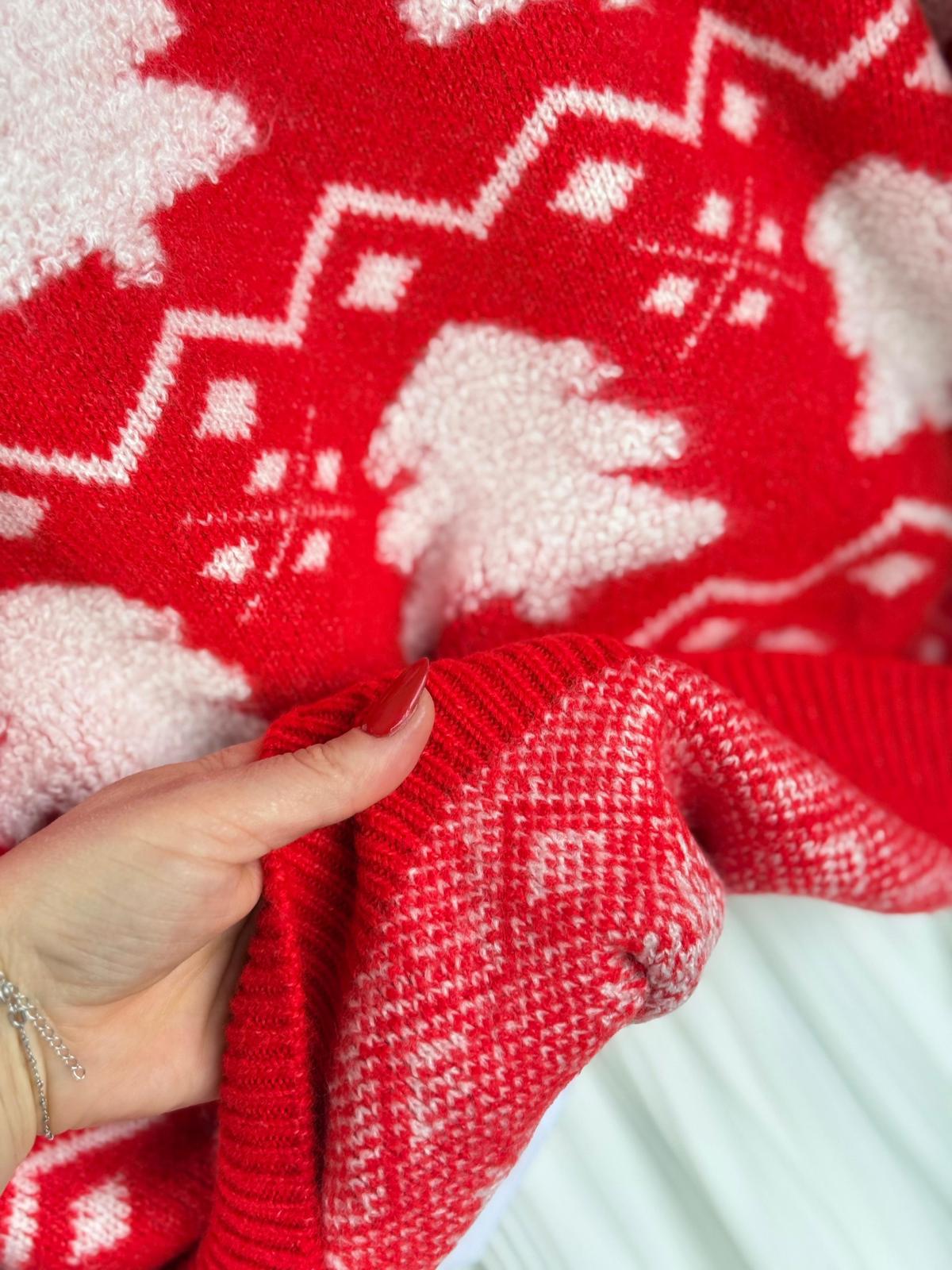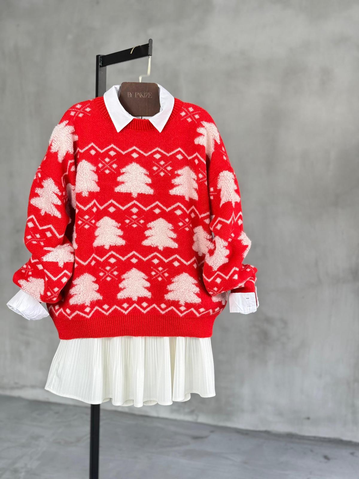 NuNu By yeni yıl temalı beyaz kar tanesi desenli kadın kazak, kırmızı zemin üzerindeki zarif tasarımıyla yılbaşı kombinlerine sıcak ve eğlenceli bir hava katar. Yumuşak dokulu triko kumaşı sayesinde soğuk havalarda konforlu bir kullanım sunar.