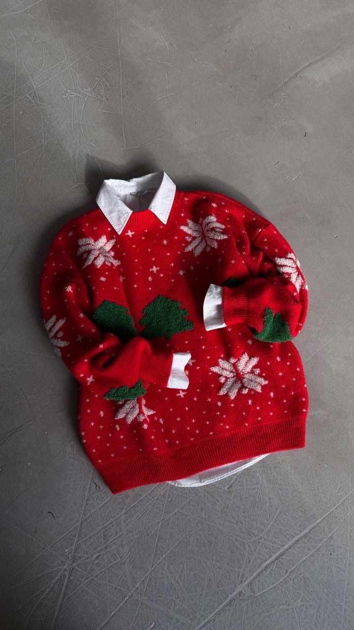 NuNu By yeni yıl temalı yeşil ağaç desenli kadın kazak, kırmızı zemin üzerindeki dikkat çekici tasarımıyla yılbaşı kombinlerinin vazgeçilmez parçası olur. Yumuşak dokulu triko kumaşı sayesinde soğuk havalarda sıcak tutarken gün boyu konfor sağlar.
