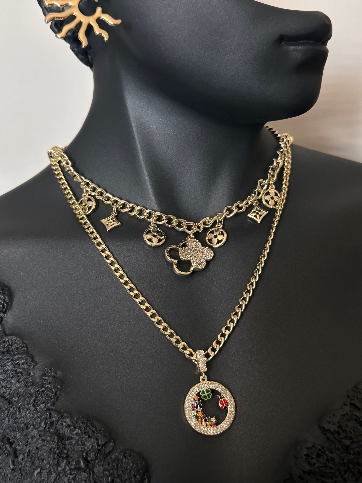 Pirinç Gold Van Cleef Model Zirkon Taş Kombin Kolye